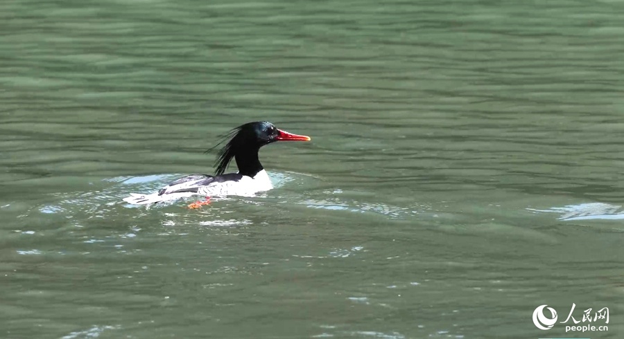 一只中华秋沙鸭在水中玩耍。人民网记者 陈蓝燕摄