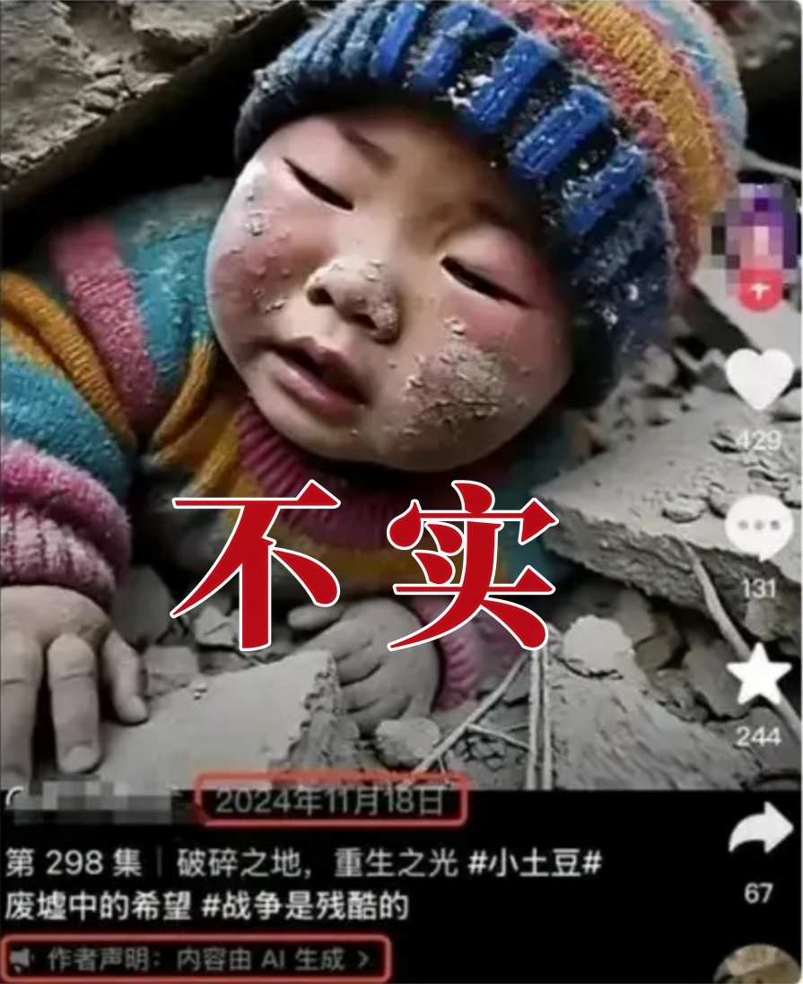 引热议的“地震小孩被埋图”被曝去年就在某平台的一条短视频中出现过,并声明是Al生成。